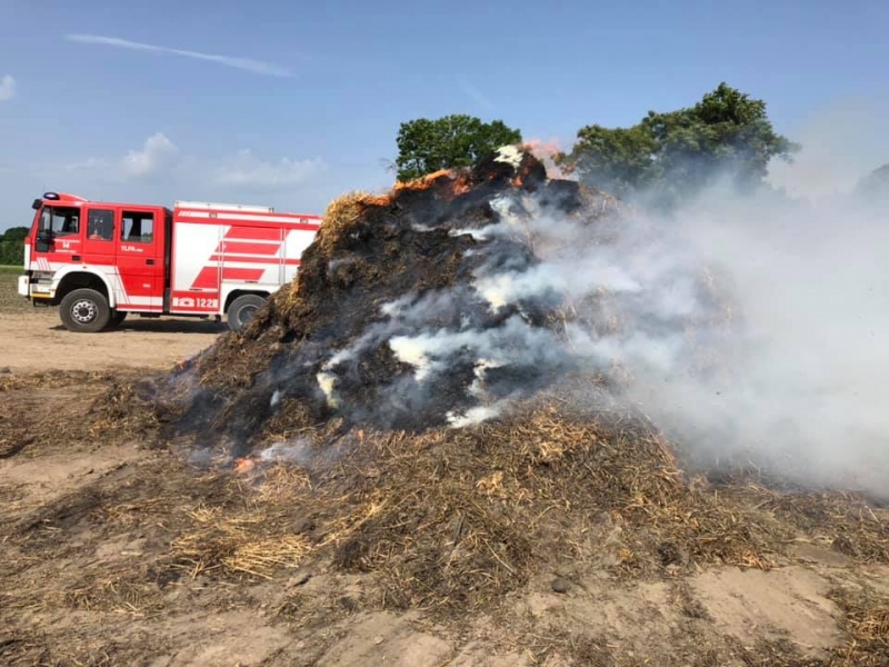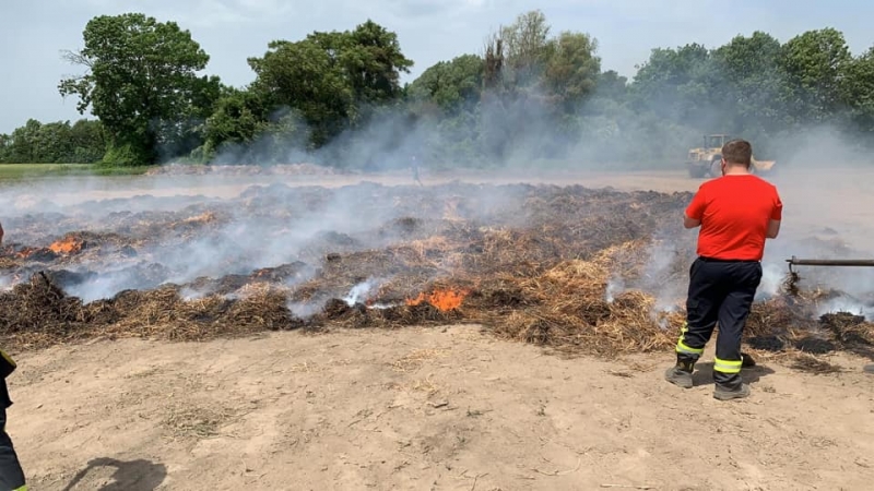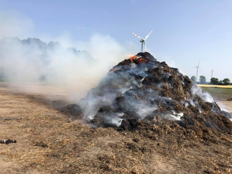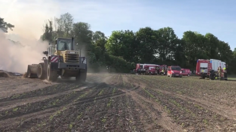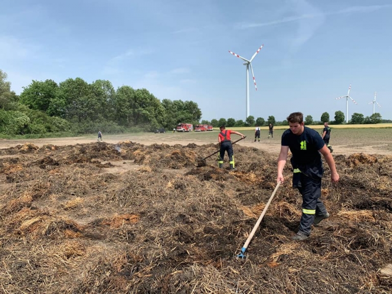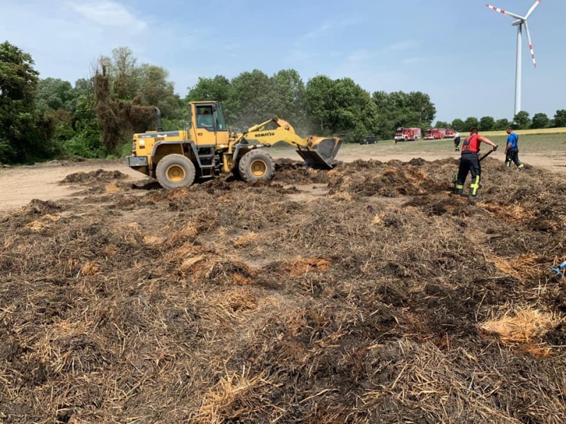 Mit einem Radlader wurde das brennende Stroh vom Waldrand entfernt und auf einem angrenzenden Acker kontrolliert abgebrannt. Nach vier Stunden Einsatz konnten die Einsatzkräfte wieder einrücken. Die Fahrzeug und Geräte Pflege dauerte bis ca 21:30 an.Nachlöscharbeiten nach Strohtristenbrand!