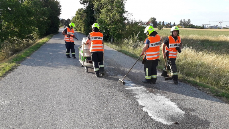 Am 10.07. um 18:30 traf die Alarmierung zu einem Schadstoffeinsatz in der Benzolstraße bei uns ein. Wie sich zeigte, hatte sich ein Fahrzeug die Ölwanne aufgerissen und in Folge dessen die Fahrbahn auf mehreren Metern verunreinigt. Mittels Bioversal und Ölbindemittel konnte das ausgetretene Betriebsmittel beseitigt werden.Nur etwa 5 Minuten nach dieser Alarmierung erreichte uns während der Arbeiten ein weiterer Einsatz. Nach einem Unfall war ein Motorrad in der Großmittelstraße zu bergen. Das Fahrzeug wurde gesichert abgestellt, sodass dieser Einsatz rasch abgeschlossen war. Polizei und Rettung waren ebenfalls vor Ort.