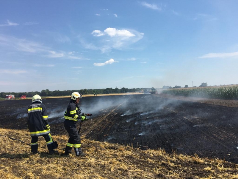 Am 20. Juli gegen 14:20 Uhr wurde die samstägliche Nachmittagsruhe je durch das Heulen der Sirenen gestört. Ein Feld neben der Verbindungsstraße zwischen Zillingdorf-Markt und Zillingdorf- Bergwerk war in Brand geraten. Sofort rückten die Feuerwehren Zillingdorf-Markt und Zillingdorf-Bergwerk zum Einsatzort aus. Bereits bei der Anfahrt waren schwarze Rauchschwaden zu sehen. Unmittelbar nach Eintreffen am Einsatzort begannen die eingesetzten Kräfte mittels Schnellangriffseinrichtungen mit der Brandbekämpfung. Drei Mitglieder unsrer Feuerwehr, die auch Bauern sind, kamen zusätzlich mit Traktor und Gerätschaft zum Einsatzort und unterstützten die Löscharbeiten maßgeblich. Durch den gezielten Einsatz von Löschmittel und Traktoren konnte der Brand rasch gelöscht werden.