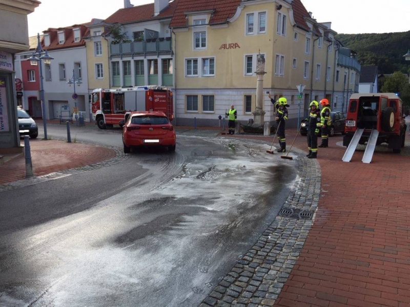 Am Sonntag, dem 04.08.2019 wurden Mitglieder der Feuerwehr Markt Piesting gegen 17:45 Uhr von einem aufmerksamen Autofahrer über eine Ölspur im Bereich des Marktplatzes in Kenntnis gesetzt. Ein unbekanntes Fahrzeug hatte auf einer Länge von rund 150m Dieseltreibstoff verloren. Vor allem in einer Kurve war der Schadstoffaustritt massiv. Die Fahrbahn würde durch die Feuerwehr gereinigt und Warnschilder aufgestellt.