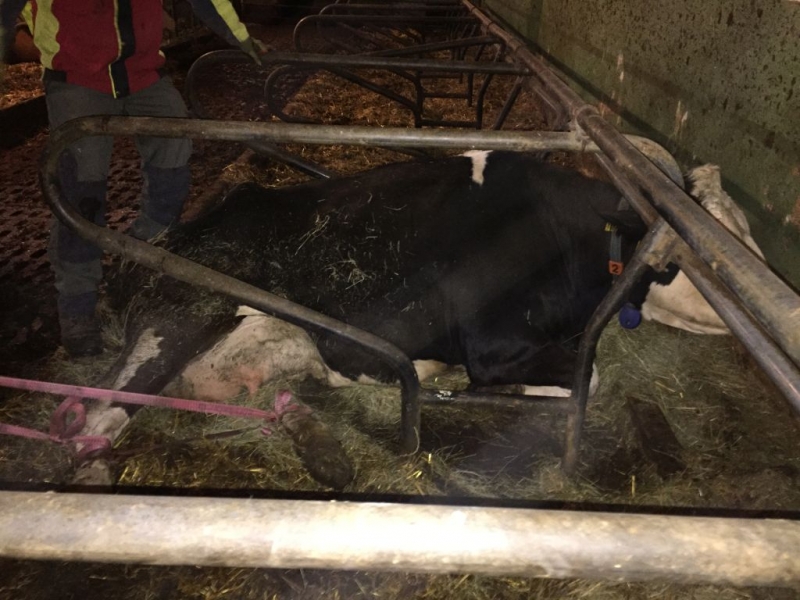 Am Rückweg ins Feuerwehrhaus kam es noch zu einer Tierrettung: ein paar der eingesetzten Feuerwehrmitglieder unterstützen einen örtlichen Landwirt, eine im Stall zu Sturz gekommene Kuh aus ihrer misslichen Lage zu befreien.