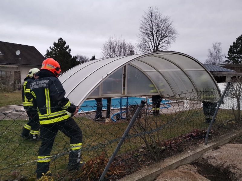 Kurz nach Mitternacht, um 00:39 Uhr erfolgte die nächste Alarmierung. Der Sturm drohte ein Dach eines Einfamilienhauses in der Birkengasse abzudecken. Bereits um 7:01 Uhr ging es zu den nächsten Aufräumarbeiten. Im Garten eines Einfamilienhauses in der Augasse stürzten 2 Bäume um. Und schlussendlich musste noch kurz nach 17 Uhr am Montagabend einen Schwimmbadabdeckung, die der Sturm über den Zaun zum Nachbargrundstück „befördert“ hatte, gesichert werden.