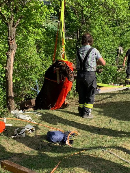 Nach dem Eintreffen der Tierärztin und des geländegängigen Kranfahrzeuges der FW Markt Piesting konnte die Befreiung aus der misslichen Lage schnell und schonend erfolgen. Das Pferd konnte nach einer kurzen Verschnaufpause selbständig den Weg in den Stall antreten und ist wohl mit dem Schrecken davongekommen. Alle Beteiligten waren froh, dass der Vorfall einen so glimpflichen Ausgang nahm.