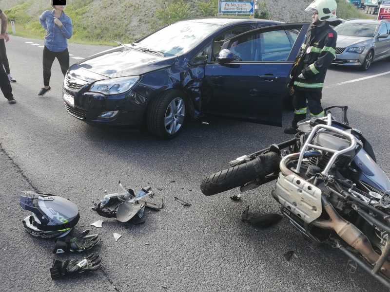 Zu einem Zusammenstoß zwischen einem Motorradfahrer und einem PKW kahm es am 18.06.2020 gegen 17.00 Uhr im Kreuzungsbereich Nordspange/LH151. Der Motorradfahrer wurde bei der Ankunft der Feuerwehr Theresienfeld bereits vom Rettungsteam aus Wr. Neustadt versorgt.Anschließend wurde er mit Verletzungen unbestimmten Grades ins Landesklinikum Wr. Neustadt gebracht. Die ältere PKW Lenkerin hatte einen Schock , blieb jedoch unverletzt. Die Feuerwehr führte die Fahrzeugbergung durch und reinigte die Fahrbahn im Kreuzungsbereich.