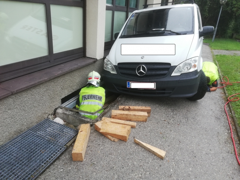 Jedoch gab das Kellerlüftungsgitter nach und das Fahrzeug steckte mit der rechten Seite im Schacht fest. Mittels Hebekissen und Pölzholz wurde das Fahrzeug angehoben, stabilisiert und konnte dann von selbst wieder auf festen Boden fahren. Da sehr behutsam bei der Bergung gearbeitet wurde, entstand kein Schaden am Fahrzeug bzw. am Gebäude.
