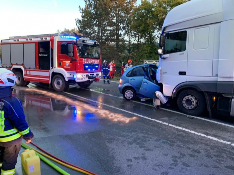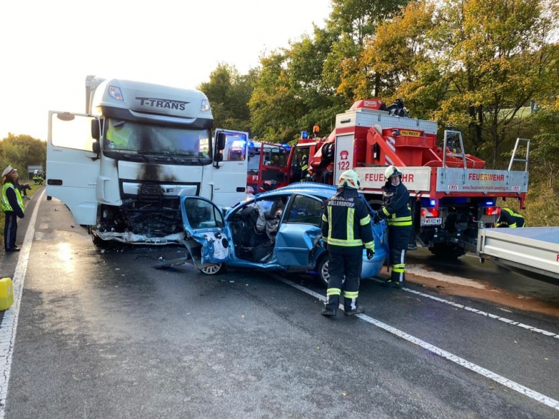 Während der Anfahrt stellte sich heraus, dass es sich um einen Verkehrsunfall mit eingeklemmter Person handelte, wobei der LKW nach dem Aufprall im Motorraum zu brennen begann. Noch vor unserem Eintreffen wurden bereits erste Löschmaßnahmen durch einen Polizisten der örtlichen Polizeiinspektion unternommen, welcher sich gerade am Weg zum Dienst befand.