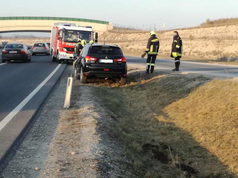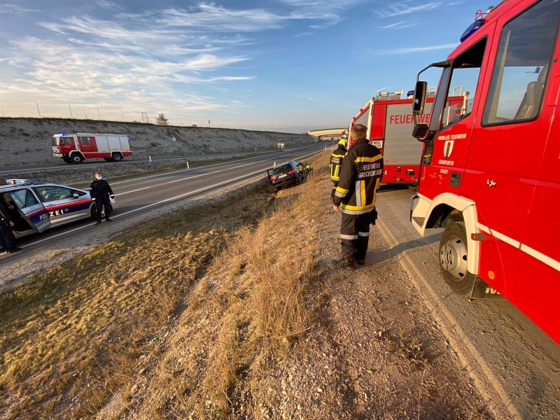 Bei der Abfahrt auf die B17 kam eine Fahrzeuglenkerin mit ihrem Fahrzeug zu weit nach links und fuhr den Abhang zur B17 hinab. Mit einem defekten linken Vorderrad kam das Fahrzeug mit einer deutlichen Schräglage im Graben zum Stillstand.