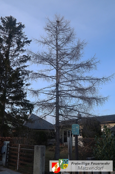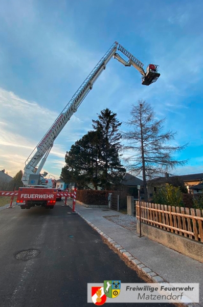 Eine Katze hatte bereits einige Zeit in einem Baumwipfel ausgeharrt, weshalb die Feuerwehr gerufen wurde, um diese von dort zu retten. Aufgrund der Höhe des Baumes und weil der Wipfel recht dünn war, alarmierte die Feuerwehr Matzendorf den Steig Felixdorf hinzu. Mit diesem konnten die Einsatzkräfte schließlich sicher bis zum Baumwipfel und somit zur Katze gelangen und diese wieder auf den Boden holen. Das Tier konnte schließlich seinen Besitzern übergeben werden.