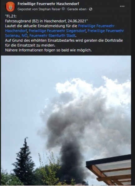Am Donnerstag den 24.06.2021 zeigte dichter Rauch über Haschendorf den Weg zum dritten Einsatz des heutigen Tages. Um 12:16 Uhr heulten erstmals die Sirenen für die beiden Feuerwehren Haschendorf und Ebenfurth.