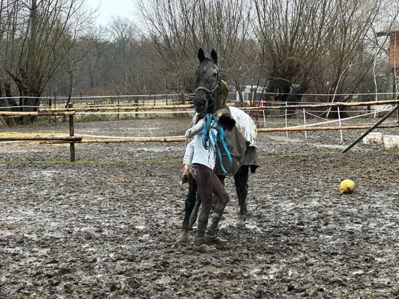 In enger Zusammenarbeit zwischen Tierarzt, Feuerwehr und Besitzern gelang es das Pferd von der Heuraufe wegzuziehen und beim aufstehen zu unterstützen. Da aufgrund des matschigen Bodens mit keinem Fahrzeug zugefahren werden konnte mussten diese Tätigkeiten per Muskelkraft erledigt werden.