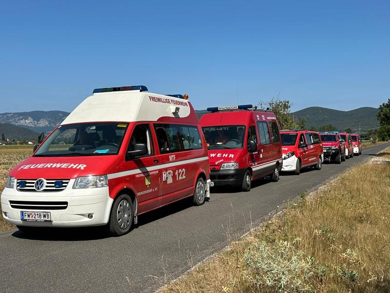 Die Freiwilligen Feuerwehren FF-Weikersdorf am Steinfeld, Freiwillige Feuerwehr Winzendorf, Freiwillige Feuerwehr Brunn und FF Wiener Neustadt sowie Polizei, Rotes Kreuz und Suchhundestaffeln waren am 3. August im Einsatz um eine abgängige Person auf Grund eines Hinweises im Föhrenwald zu suchen.