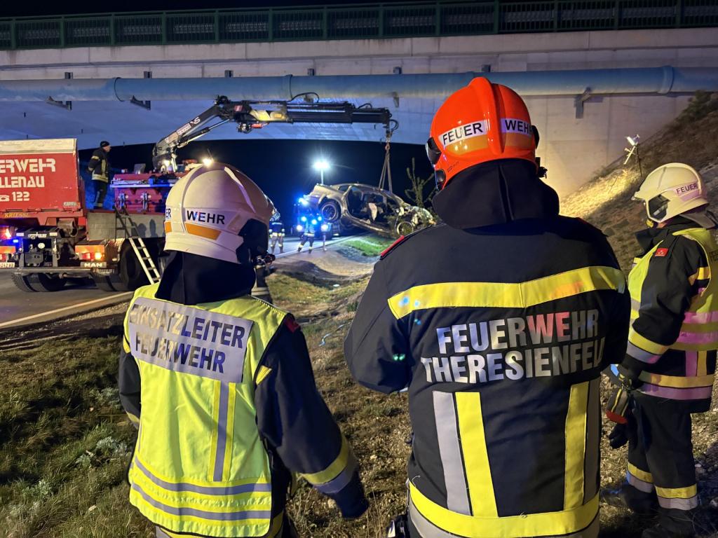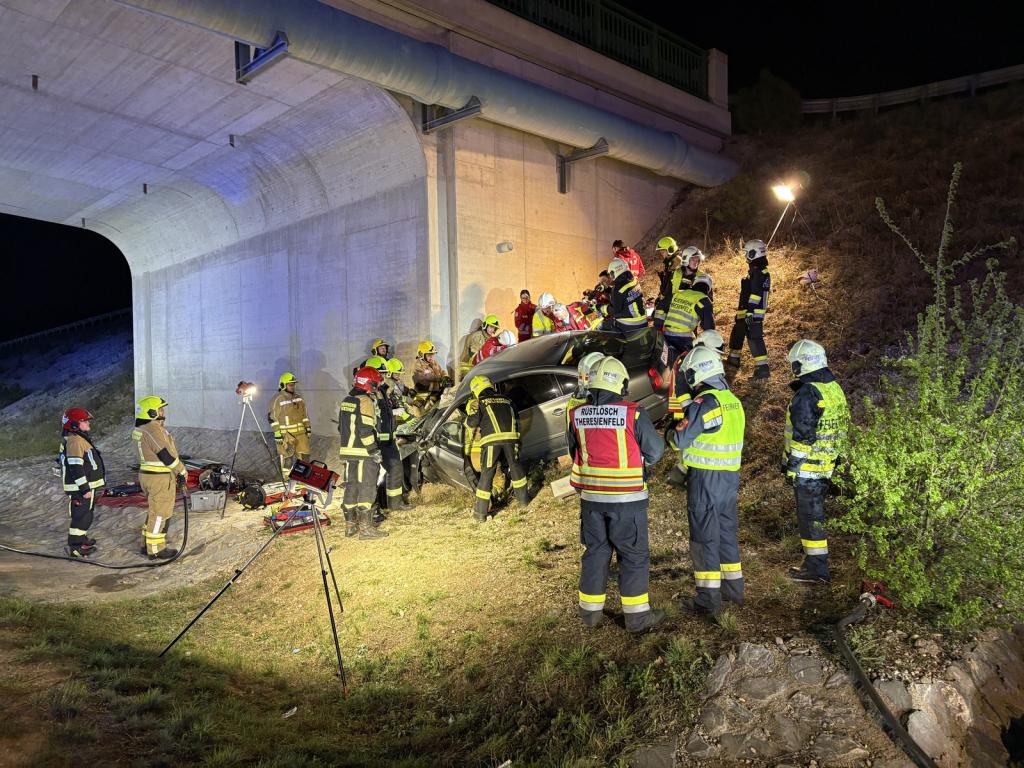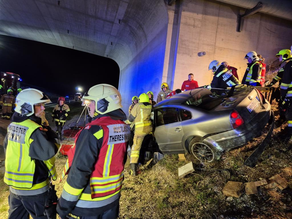 Zum zweiten Mal ertönte das Sirenensignal „Feuerwehreinsatz“ um 21:30 Uhr. Der Grund dieser Alarmierung war ein Verkehrsunfall mit Menschenrettung. Ein PKW rammte im Gemeindegebiet von Theresienfeld auf der B17 (Umfahrungsstraße) frontal einen Brückenpfeiler. Der Beifahrer wurde beim Aufprall im Fahrzeug eingeklemmt und musste durch die Feuerwehr mit einem hydraulischen Rettungsgerät befreit werden. Auch der Fahrer musste verletzt aus dem Fahrzeug gerettet werden. Neben den alarmierten Feuerwehren Theresienfeld, Felixdorf, Sollenau und Eggendorf war auch ein Großaufgebot des Rettungsdienstes vor Ort. Ein Verletzter wurde mit dem Notarzthubschrauber, der zweite bodengebunden in die Spitäler transportiert. Die FF Theresienfeld rückte mit 22 Feuerwehrmitgliedern aus.