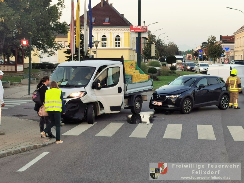 Am 21. September 2020, gegen 6 Uhr 40, wurde die Feuerwehr Felixdorf zu einem Verkehrsunfall auf der Hauptstraße (ehem. B21a) alarmiert. Im ampelgeregelten Kreuzungsbereich mit der Schulstraße stießen aus derzeit ungeklärter Ursache ein PKW mit einer vollbesetzten Pritsche seitlich frontal zusammen.