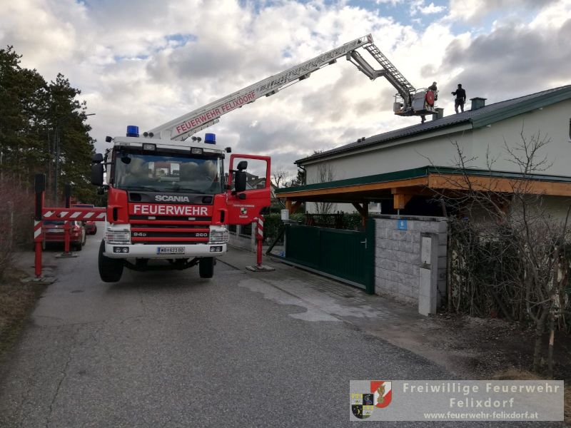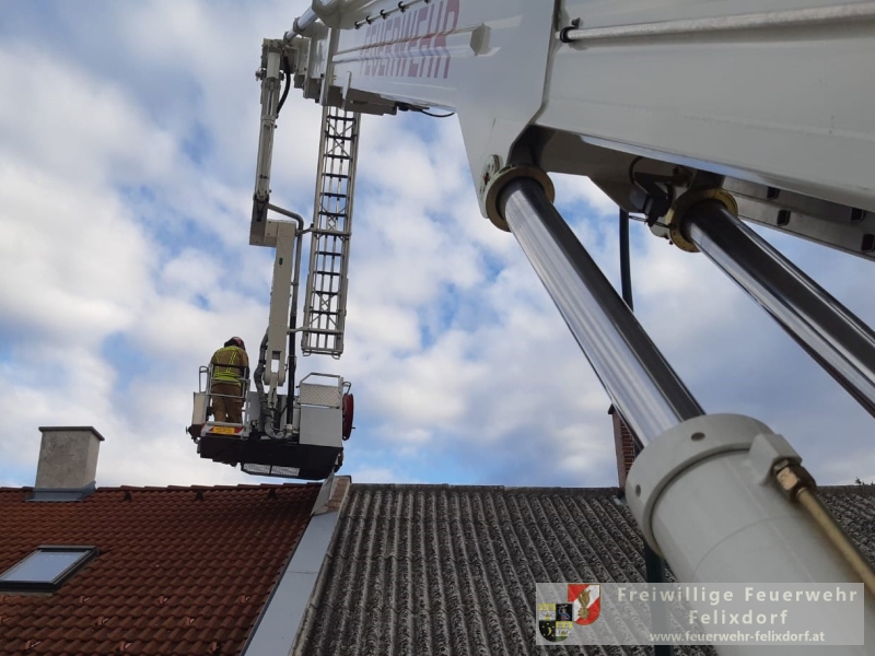 Am 3. März 2020, gegen 15 Uhr 40, wurde die Feuerwehr Felixdorf zu einem Sturmschaden an der Hauptstraße alarmiert. Ein aufmerksamer Verkehrsteilnehmer hat lose Blechteile an einem Einfamilienhaus wahrgenommen. Zu diesen Zeitpunkt herrschte böiger Wind, wodurch die langen Bahnen drohten in den fließenden Verkehr zu stürzen.