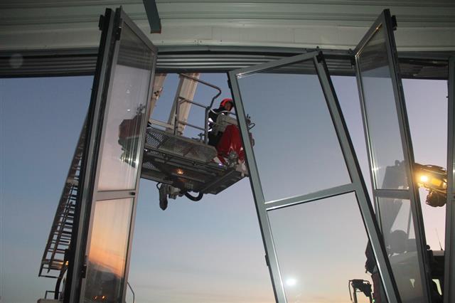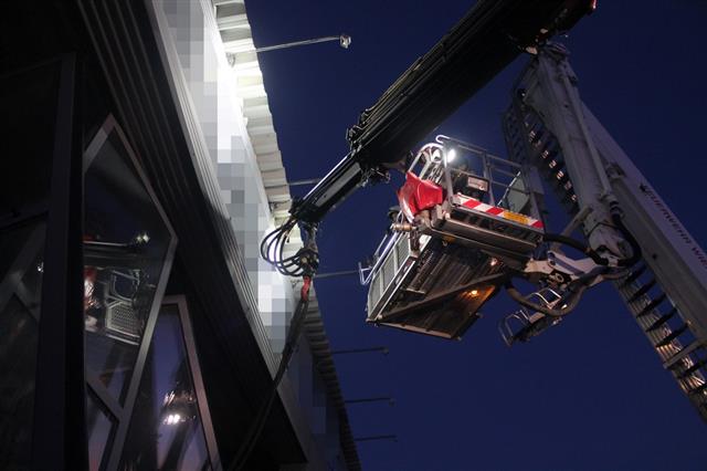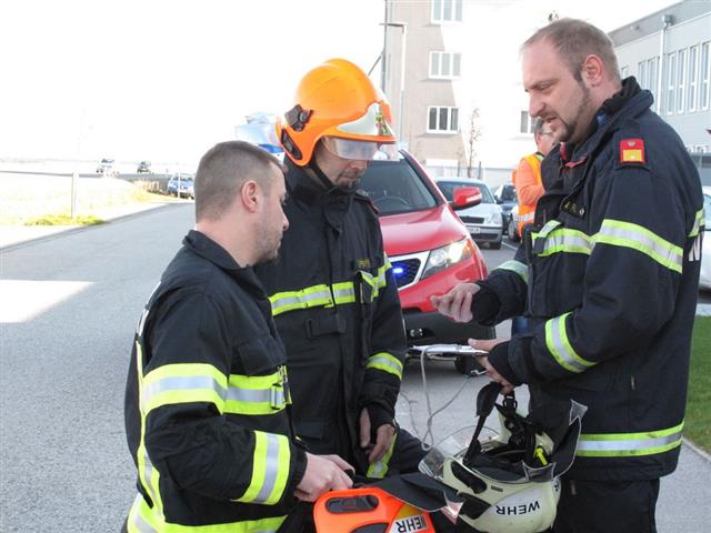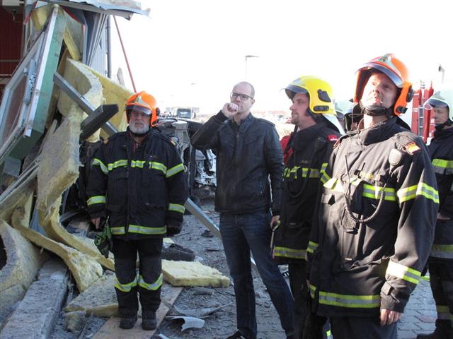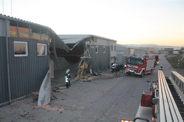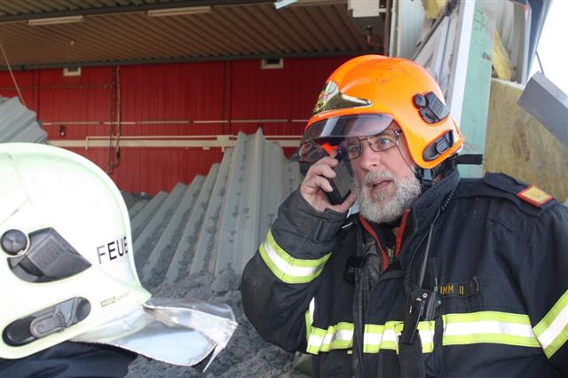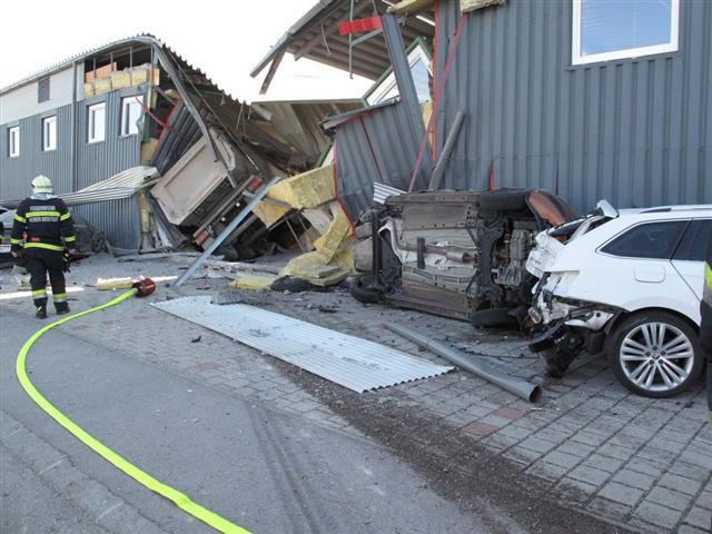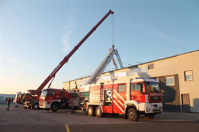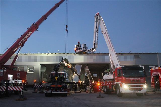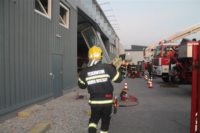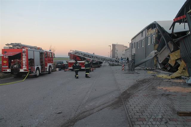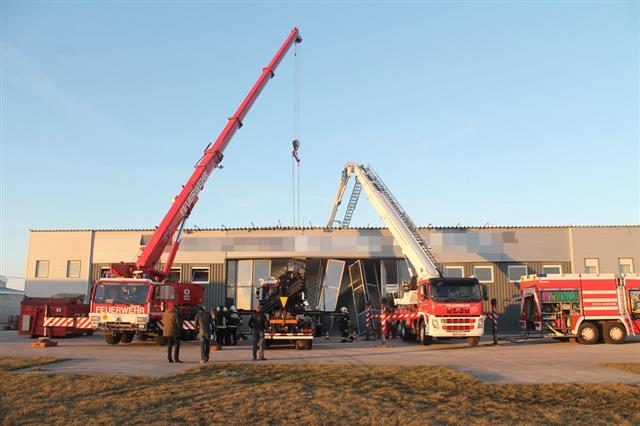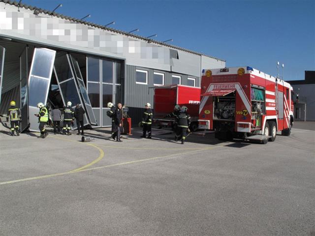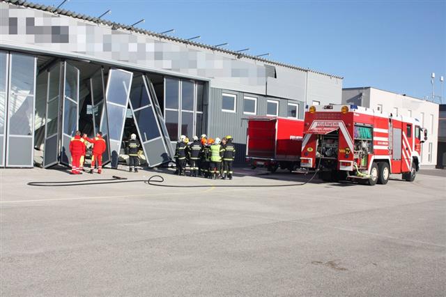 Es folgte ein Großeinsatz der Feuerwehr. Der ABI Alfred Grimm, der ersteintreffende Einsatzleiter, ließ aufgrund des auslaufenden Diesels und Benzins der Fahrzeuge sofort Brandschutz mittels Schaumrohr von beiden Seiten der Halle aufbauen. Auch wurde ein Betretungsverbot ausgesprochen und ein Statiker alarmiert. Nach Rücksprache mit der Firmenleitung veranlasste diese die Abschaltung der Hauptstromzufuhr durch den Energiebetreiber.