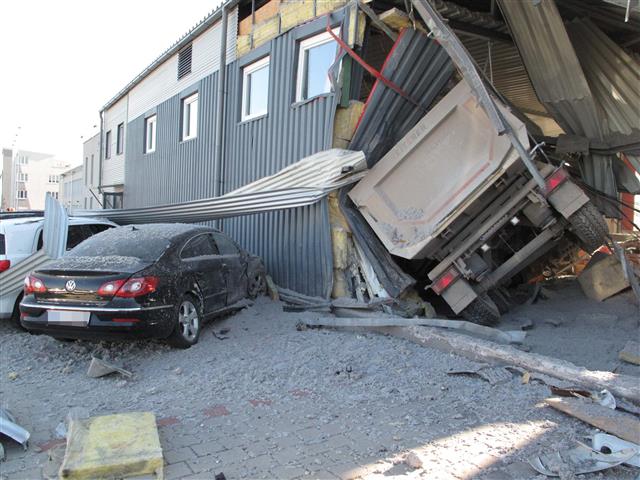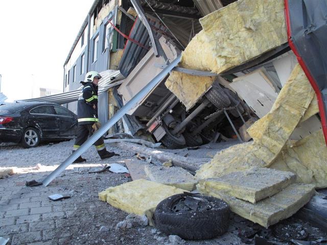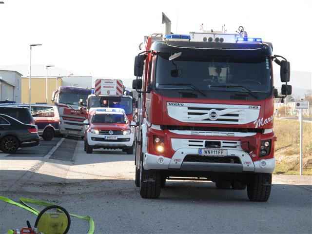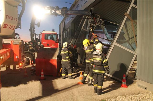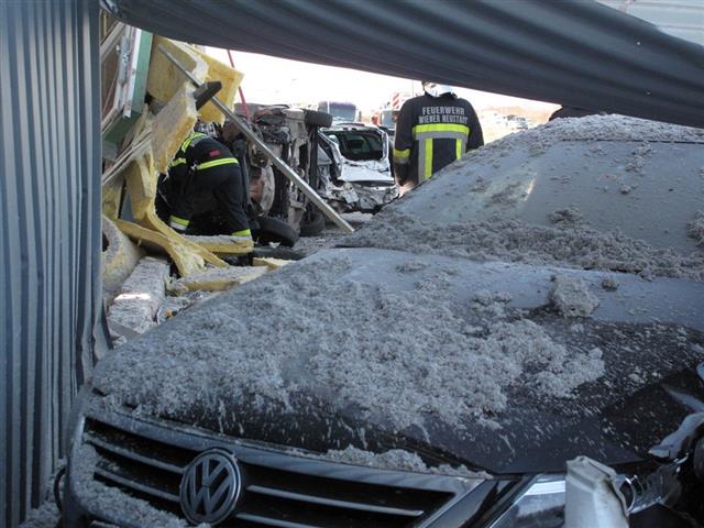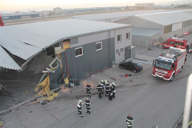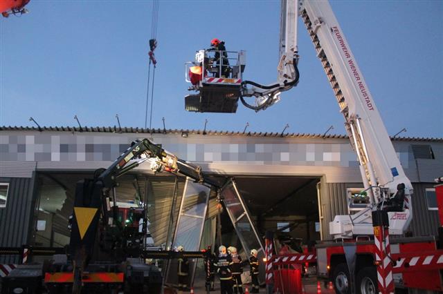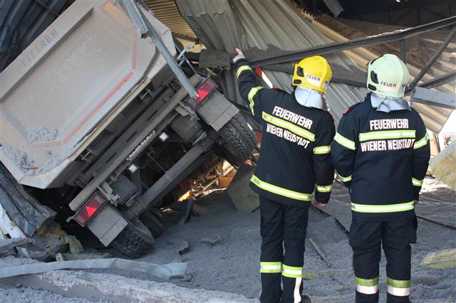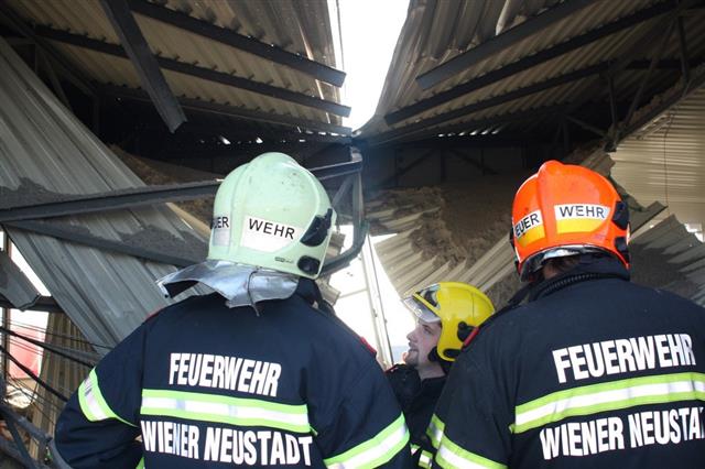Der mit Schotter beladene Sattelzug kam aus bislang ungeklärter Ursache von der Straße ab und fuhr über eine Böschung in eine Reihe parkende Pkw und in weiterer Folge in eine Halle am Rande des Flugfeldes Ost in Wiener Neustadt. Wie durch ein Wunder konnte der Lkw-Fahrer durch Firmenmitarbeiter unverletzt aus dem Zugfahrzeug befreit werden. Nach Besprechung mit dem Statiker und der Firmenleitung wurde mit dem Sichern der Halle durch das schwere Kranfahrzeug und den Hubrettungsgeräten der Feuerwehr Wiener Neustadt für die Bergung des Lkw durchgeführt. Der Lkw wurde aus den umgerissenen Stahlträgern behutsam befreit und im Anschluss mittels Seilwinde aus der Halle gezogen.