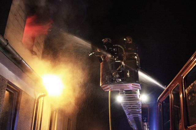 Da das Feuer auch auf den Dachstuhl übergegriffen hatte, wurden große Teile der Dachhaut von außen mittels zweier Hubrettungsgeräte geöffnet. Nachdem der Brand im ersten Stock gelöscht werden konnte, gingen weitere Atemschutztrupps von innen gegen den Brand im Dachstuhl vor. Insgesamt standen 36 Atemschutzgeräteträger im Einsatz, welche regelmäßig in den Einsatz rotierten.