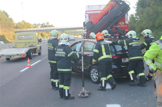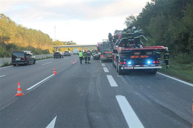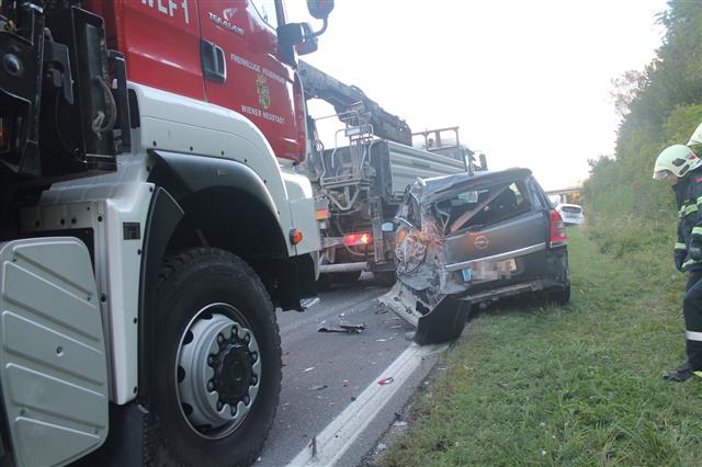 Eine verletzte Person und umfangreiche Verzögerungen im Morgenverkehr waren das Ergebnis eines schweren Verkehrsunfalles auf der Südautobahn am Dienstagmorgen, 25.09. Unmittelbar vor der Abfahrt Wöllersdorf kollidierten drei Pkws und ein Lkw miteinander. Die Feuerwehr führte die Fahrzeugbergung durch. Eine Lenkerin musste ins Krankenhaus.