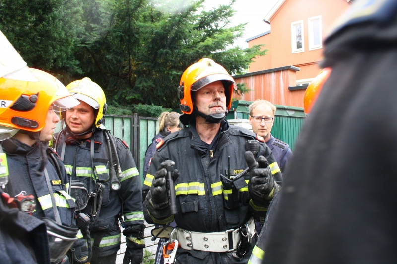 Bei der Einsatzbesprechung um 16:35 Uhr stellte Einsatzleiter Pfeiffer wie folgt fest: "Durch den Spalt in der Decke im ersten Obergeschoss herrscht Einsturzgefahr. Wir brechen den Innenangriff ab und gehen über zum Angriff über die Drehleiter. Obergeschoss und Erdgeschoss sind abgesucht und keine Kinder sind gefunden worden. Ein Trupp sucht noch im Keller."