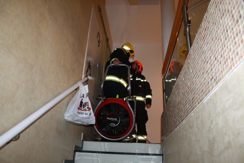 Beim Eintreffen der Feuerwehr drang ein mit Atemschutz ausgerüsteter Trupp in den Keller vor. In der Küche wurde noch das stark qualmende Kochgut und bereits stark angesengte Teile der Einrichtung vorgefunden werden. Das glosende Kochgut konnte rasch vom Herd entfernt und endgültig abgelöscht werden. Mittels Wärmebildkamera wurde die Kücheneinrichtung auf verbleibende Glutnester kontrolliert, während weitere Verstärkungskräfte eine Druckbelüftung des stark verrauchten Kellers durchführte.
