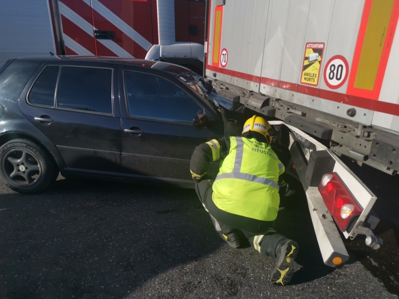 Parallel dazu ließen Kameraden der Feuerwehr die Luft aus den Vorderreifen des verunfallten Pkw, um diesen etwas abzusenken, und veranlasste den Lkw-Fahrer, die Luftfederung seines Aufliegers aufzublasen. Damit konnte der Lkw einfach vom Fahrzeug "herunterfahren". Der fahruntaugliche Pkw wurde durch das schwere Rüstfahrzeug auf einem Parkplatz gesichert abgestellt, von wo es durch den Besitzer abgeschleppt wird. Der Fahrer des Pkw wurde mit Verletzungen unbestimmten Grades ins Krankenhaus Wiener Neustadt gebracht.