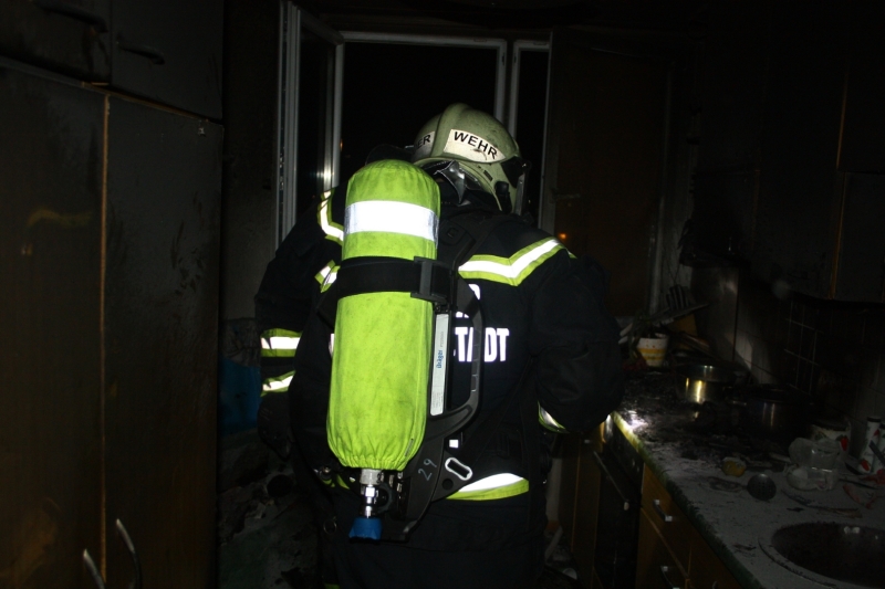 Beim Eintreffen des ersten Feuerwehrfahrzeuges war das Stiegenhaus bereits stark verraucht. Der Brand konnte vom Atemschutztrupp rasch in der Küche lokalisiert und mittels einer Löschleitung unter Kontrolle gebracht werden. Zeitgleich führte ein zweiter Trupp mit einer Wärmebildkamera eine Personensuche in der stark verrauchten Wohnung durch, da zu diesem Zeitpunkt noch nicht klar war, wo sich die Bewohner der Wohnung aufhielten. Die Bewohnerin wurde etwas später jedoch glücklicherweise bei den Nachbarn gefunden. Sie war nach Brandausbruch geflüchtet, erlitt jedoch eine Rauchgasvergiftung und musste vom Roten Kreuz versorgt und ins Krankenhaus transportiert werden.