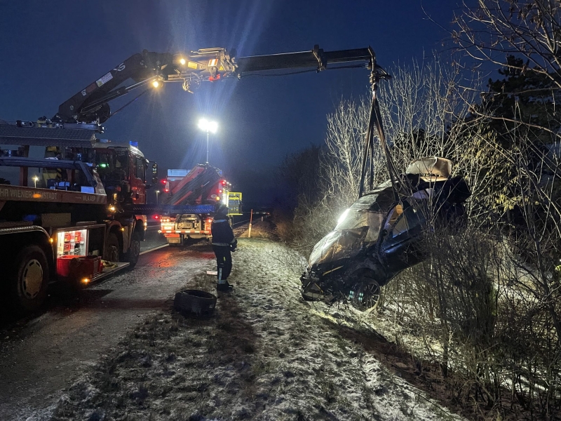 Wie die Landespolizeidirektion in einer Aussendung berichtete, war das Auto mit Sommerreifen auf winterlicher Fahrbahn unterwegs, als der Lenker die Kontrolle verlor und von der Fahrbahn abkam. Das Fahrzeug überschlug sich und blieb im Bewuchs neben der Autobahn hängen.
