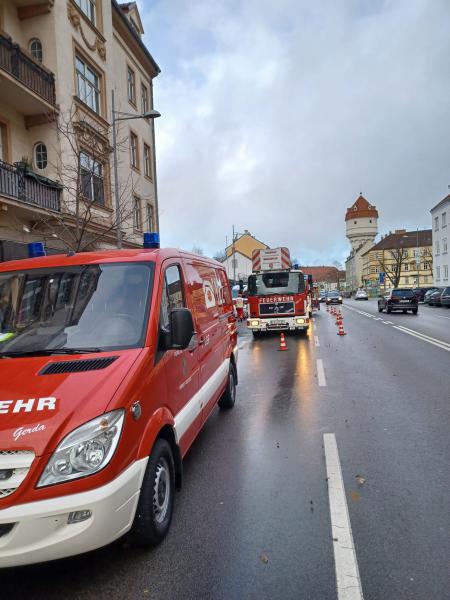 Fast zeitgleich wurde die Drehleiter in die Mießlgasse gerufen. Dort stürzten lose Teile eines Rauchfangs auf einen Pkw. Die Einsatzstelle wurde zunächst von der Feuerwehr abgesichert und vom Straßenmeister wurde die Schadensstelle letztendlich bis zur Beseitigung des Schadens am Rauchfang abgesperrt.