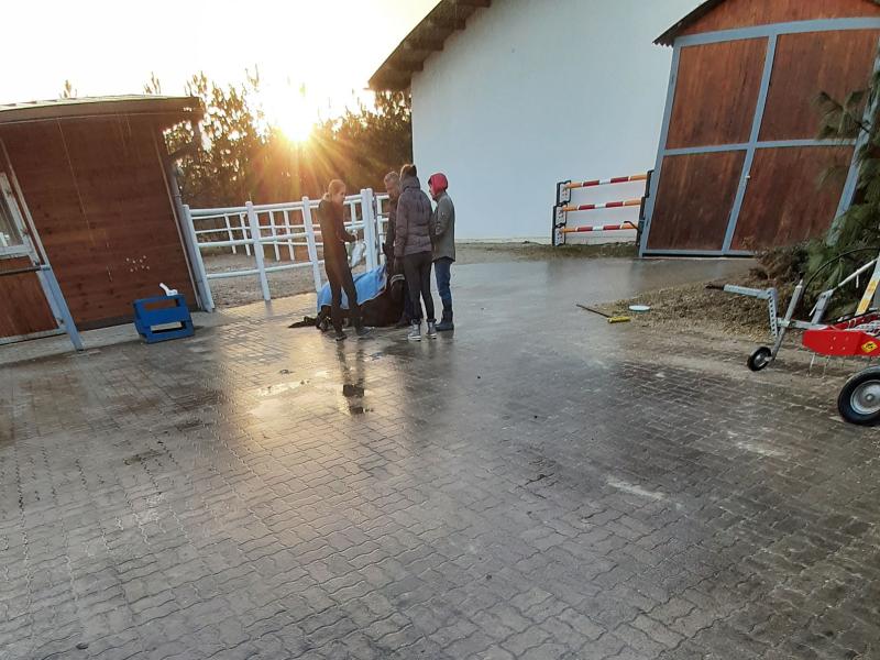 Der 35jährige Hengst "Wertiko" war aufgrund der extremen Glätte an diesem Tag am Pferdehof in der Puchbergerstraße ausgerutscht und gestürzt. Eigene Versuche der Besitzer, dem Hengst aufzuhelfen, scheiterten, weshalb die Feuerwehr zu Hilfe gerufen wurde. "Beim Eintreffen der Feuerwehr herrschte extreme Glätte. Zum Abstützen des Kranes, welchen wir als Aufstehhilfe verwendeten, musste gestreut werden", so Einsatzleiter Florian Kandelsdorfer.