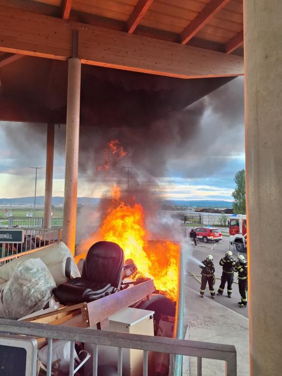 Beim Eintreffen der Einsatzkräfte schlugen bereits meterhohe Flammen aus einem Sperrmüllcontainer in einem überdachten Containerterminal. Durch einen umfassenden Löschangriff konnte der Brand von zwei Atemschutztrupps rasch unter Kontrolle gebracht werden. Um alle Glutnester abzulöschen und um dem Brandursachenermittler der Polizei Zugang zu verschaffen, wurde der Inhalt des Containers auf einer Freifläche am Betriebsgelände entleert.