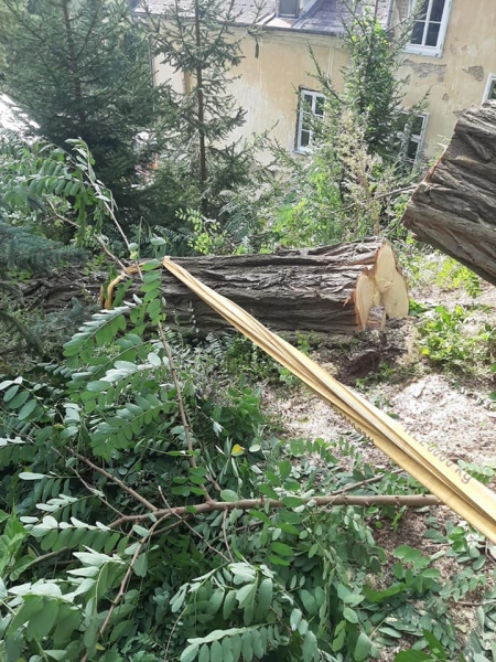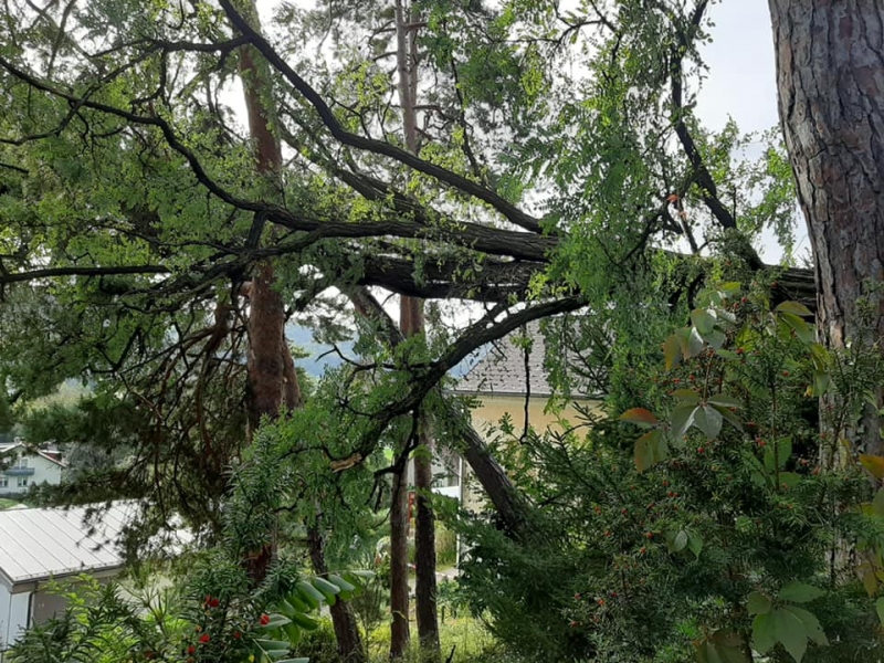 Ein Baum der mittleren Durchmesserklasse fiel durch den Wind auf einen anderen Baum, welcher dadurch ins Umfallen drohte. Jene Bäume hingen Richtung der unterhalb angrenzenden Häuser, weshalb die Anrainer die Feuerwehr riefen.