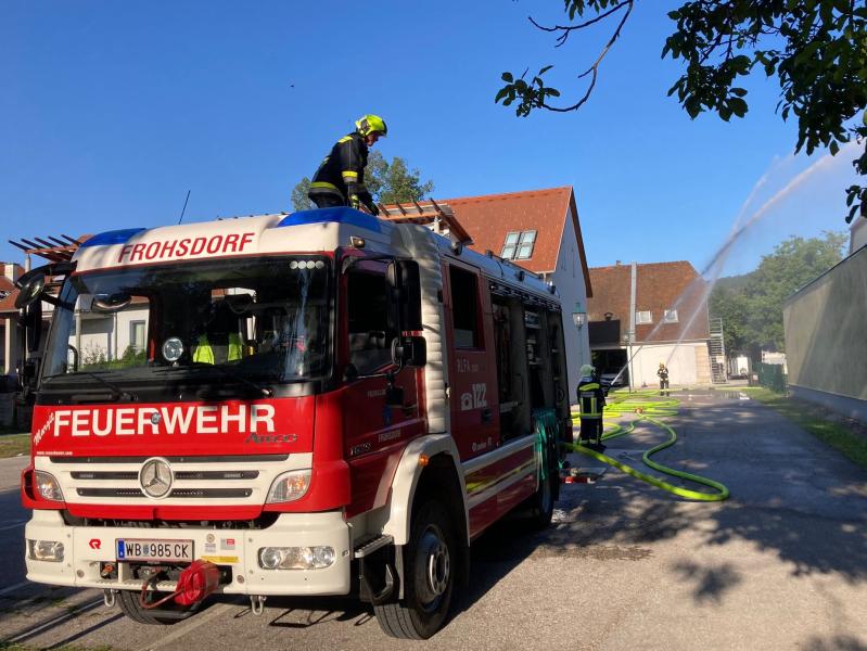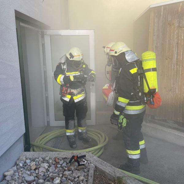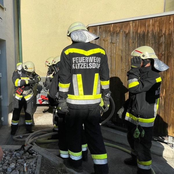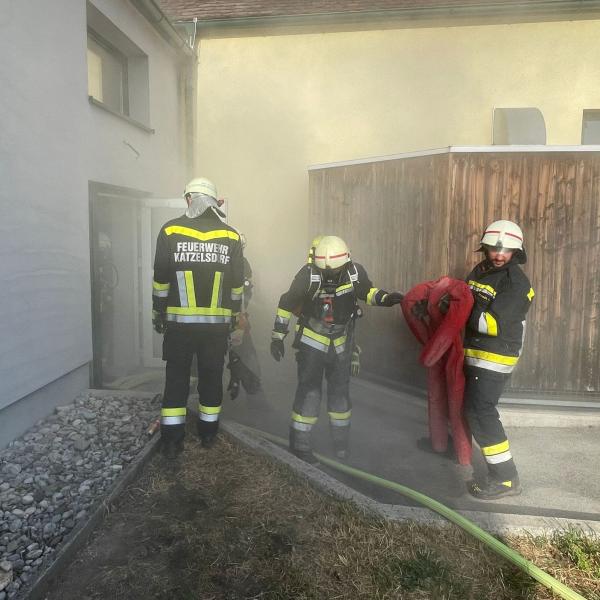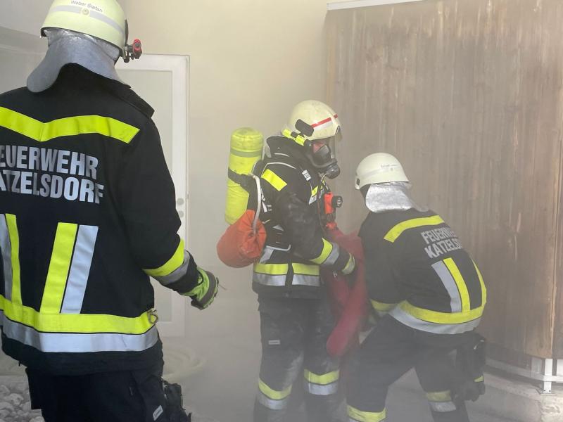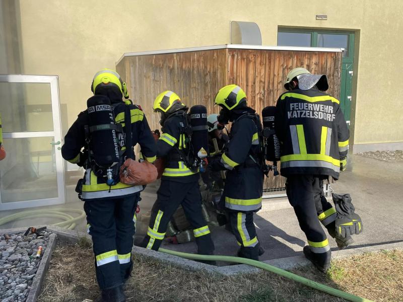 Das als erstes eintreffende Fahrzeug, das RLF Katzelsdorf begann mit der Personensuche und Brandbekämpfung im Inneren des Gebäudes mit dem ersten Atemschutztrupp.