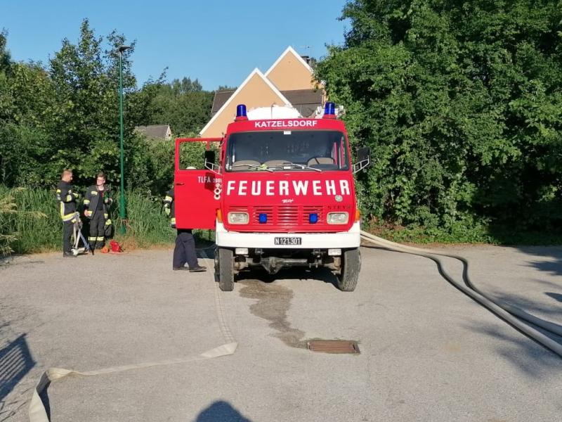 Tank 2 Katzelsdorf stellte die Wasserversorgung vom Mühlbach zu den drei anderen Tanklöschfahrzeugen her wobei die Versorgungsleitungen zum Teil bereits von den Feuerwehren entgegengelegt wurden.