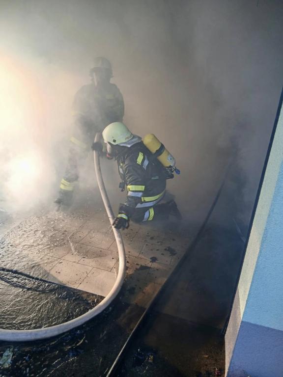 Unverzüglich nach dem Eintreffen am Einsatzort wurde eine Löschleitung vom Hydranten im Feuerwehrhaus zum Brandobjekt gelegt. Ein Atemschutztrupp nahm umgehend den Innenangriff vor. Parallel dazu wurde ein Außenangriff vorbereitet und umgesetzt, wodurch das Feuer rasch unter Kontrolle gebracht werden konnte.