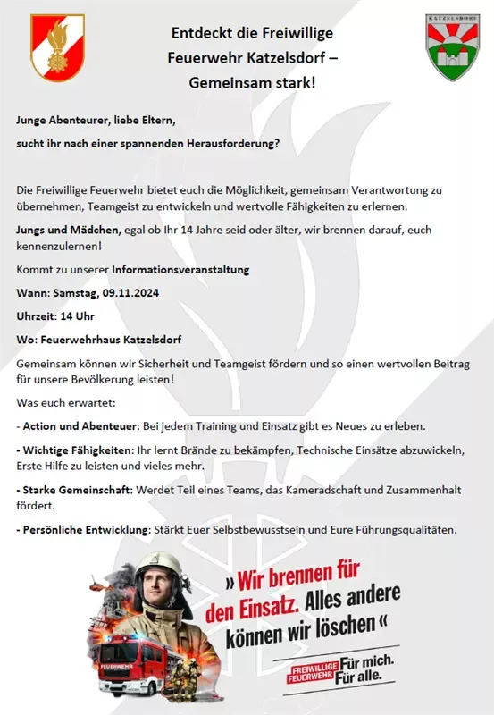 Die FF Katzelsdorf lädt alle Interessierten - ob Mädchen oder Jungen (ab 14 Jahre), Frauen oder Männer - zu der Informationsveranstaltung im FF-Haus Katzelsdorf ein.