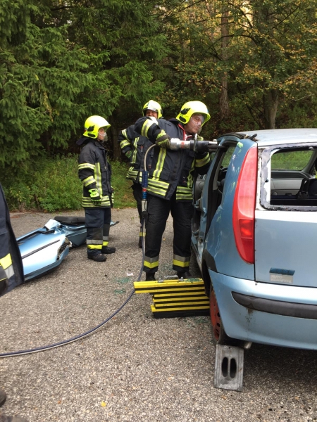 das Fahrzeug auch mit Hilfe der Hub-Zug Seilwinde aufgerichtet wurde. Danach wurde das Fahrzeug Schulungsmäßig gesichert und mittels „Spreitzer und Schere“ geöffnet.