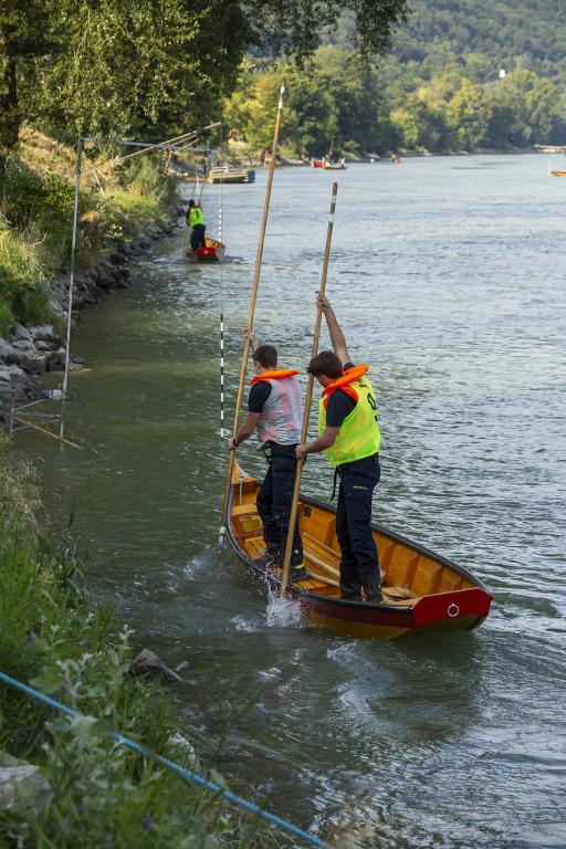 Teilnehmer, die beim Bezirkswasserdienstleistungsbewerb in Mauternbach alleine in ihren Holzzillen unterwegs waren, mussten 600 Meter zurücklegen, Zweierbesatzungen 800 Meter. Vom Start bis zur Wendeboje mussten vier Tore passiert werden. Außerdem war zwischen der dritten und vierten Boje ein sogenanntes Schwimmholz aufzunehmen, das sicher ins Ziel gebracht werden musste. „Eine besondere Herausforderung war, dass die Schubstangen nicht durchgehend eingesetzt werden konnte, sondern ein Stück der Strecke mit dem Ruder zurückgelegt werden musste“, sagt der stellvertretende Bezirksfeuerwehrkommandant Engelbert Mistelbauer – er ist im Bezirksfeuerwehrkommando Krems für das Bewerbswesen zuständig.