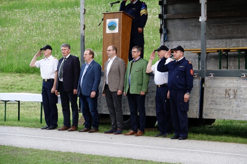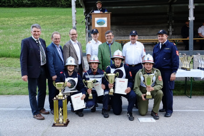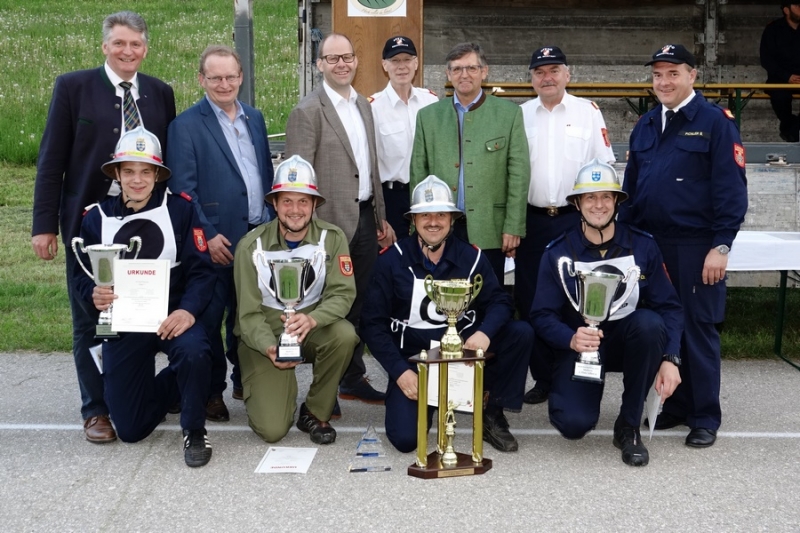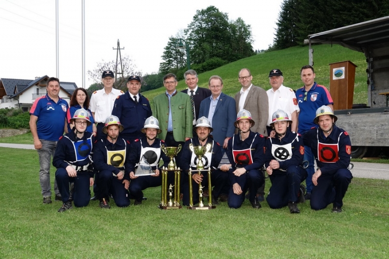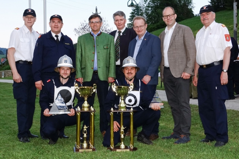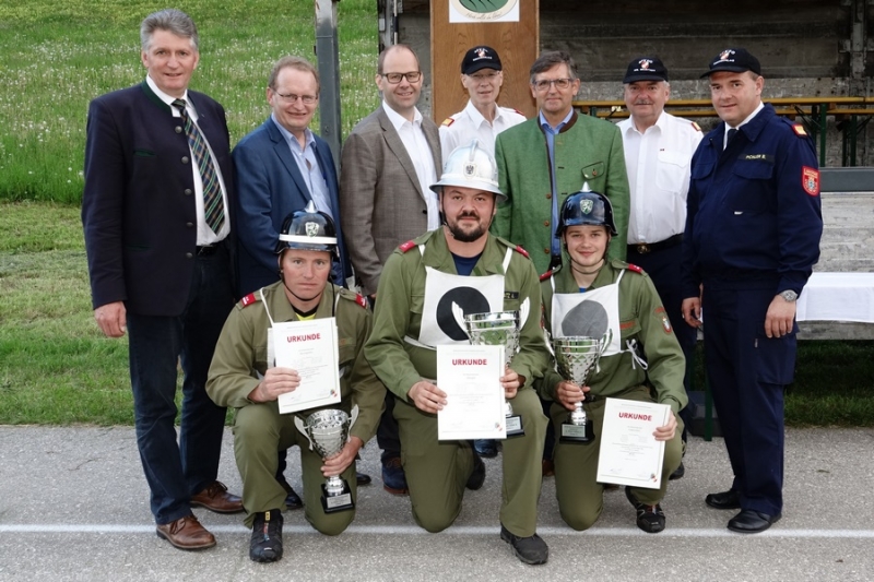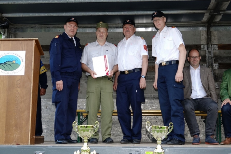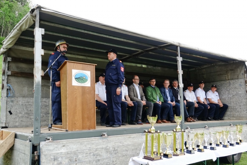 Zur Siegerehrung konnte Abschnittsfeuerwehrkommandant BR Bernhard Pichler den Bürgermeister der Marktgemeinde Hochneukirchen-Gschaidt Ing. Thomas Heissenberger, den Abgeordneten zum NÖ Landtag Ing. Franz Rennhofer die Bürgermeister Josef Freiler (Kirchschlag) und Josef Schrammel (Lichtenegg), den Bezirksfeuerwehrkommandanten OBR Rudolf Freiler, die Abschnittsfeuerwehrkommandanten BR Karl-Heinz Greiner und BR Roland Kleisz, für die Funktionäre des Abschnittes Kirchschlag Abschnittsfeuerwehrkommandant-Stellvertreter ABI Michael Lechner, sowie Feuerwehrarzt Dr. Anton Wanecek begrüßen. Von dem Nachbarbundesland Burgenland konnte Brandrat Pichler aus dem Bezirk Oberpullendorf den Bezirksfeuerwehrkommandant-Stellvertreter BR Kurt Kappel und Abschnittsfeuerwehrkommandant ABI Josef Weber begrüßen. Ein Dank ging an das Team des Roten Kreuzes. Einen Gruß und Dank ging an den Grundbesitzer des Bewerbsplatzes Johann Gamauf für die Möglichkeit der Durchführung der Bewerbe. Einen Gruß gab es auch für den MV Hochneukirchen und den Dank für die musikalische Umrahmung des Bewerbes.