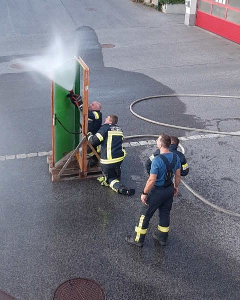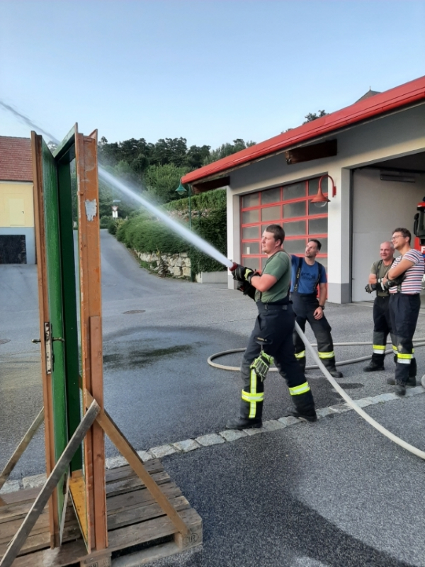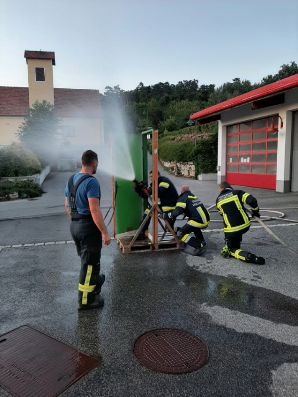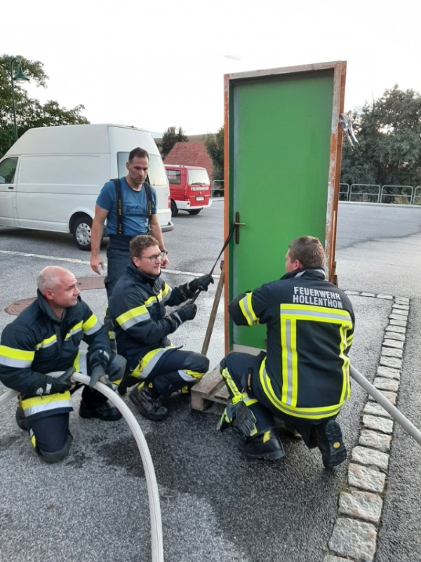 Mit einer kleinen Gruppe der Atemschutzgeräteträger beübten die FF Hollenthon die richtige Handhabung des Hohlstrahlrohres und das Vordringen in einen Brandraum (Türcheck, Türöffnung).