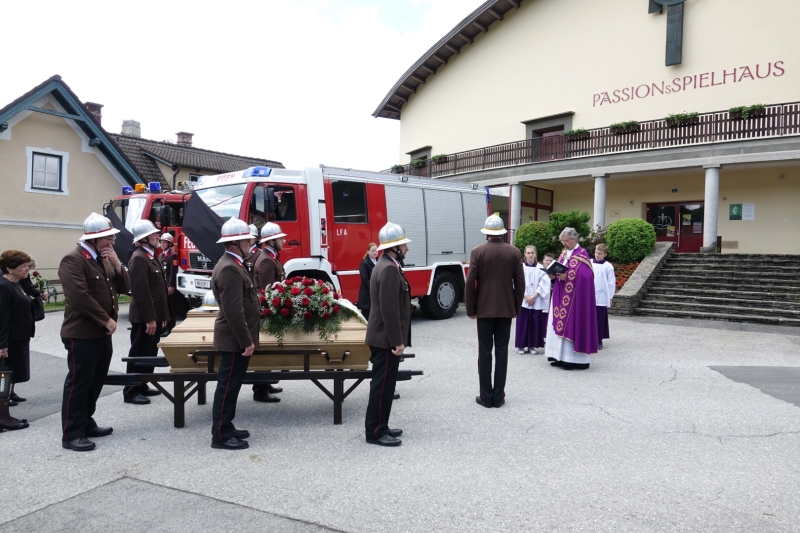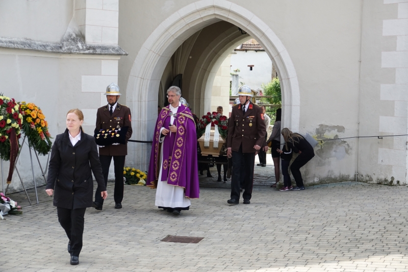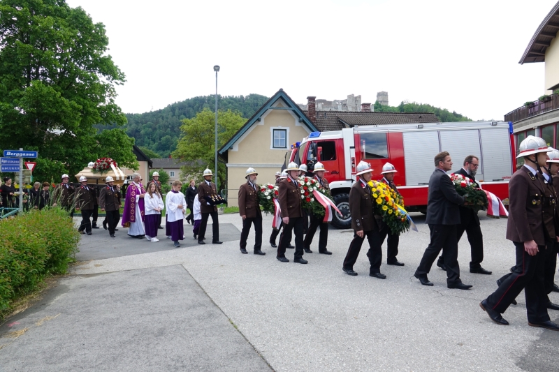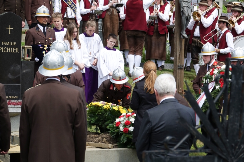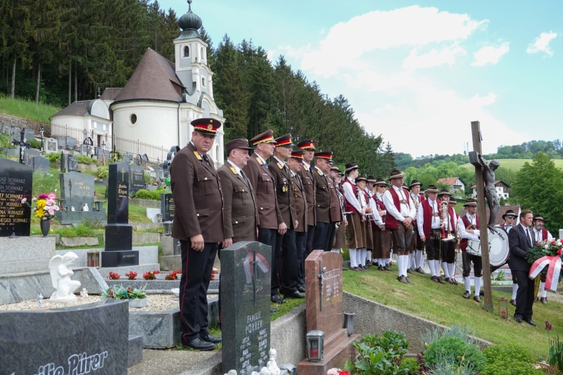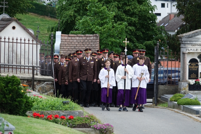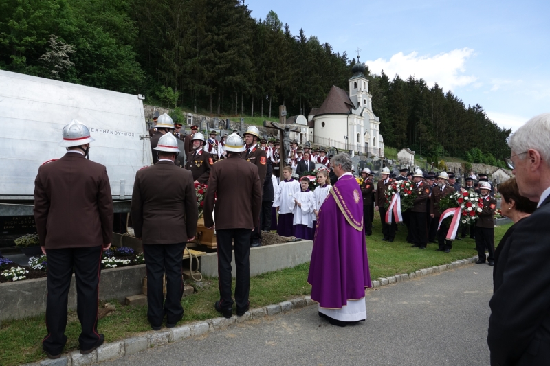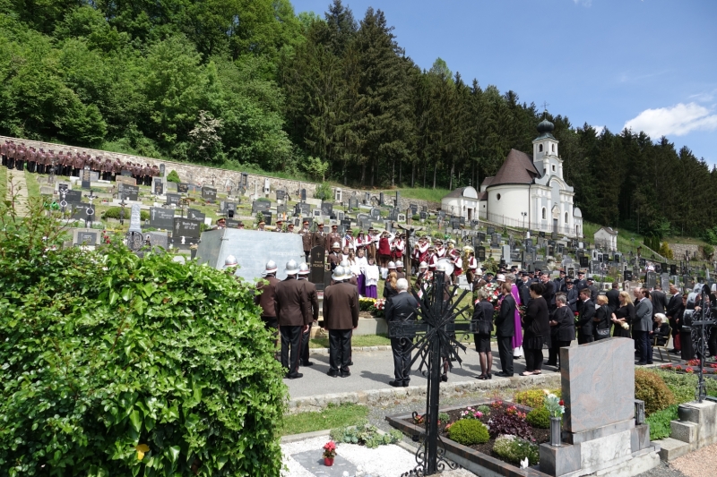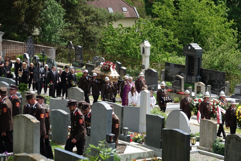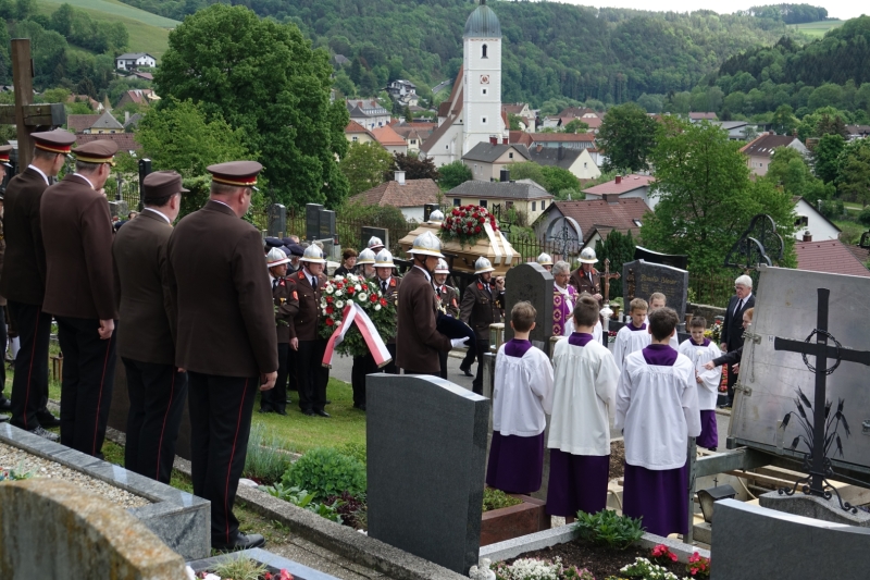 Im Anschluss wurde der Sarg von den Mitgliedern den FF Aigen in einem langen Trauerzug von der Pfarrkirche zum bis zum Familiengrab am Friedhof der Stadtgemeinde getragen. Danach folgte die Einsegnung umrahmt von der Feuerwehr, dem Männergesangsverein, der Stadtkapelle Kirchschlag, der Trauerfamilie und einer großen Anzahl von Trauernden aus der Bevölkerung aus nah und fern.