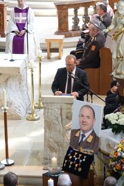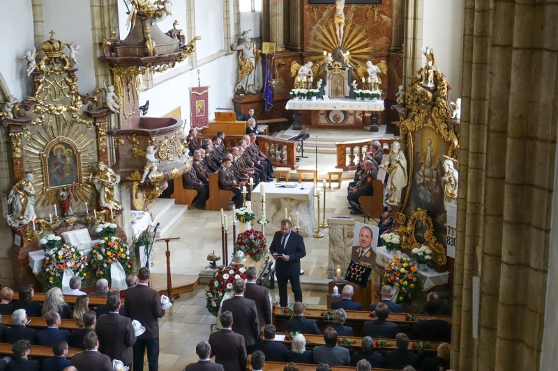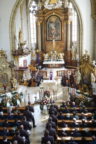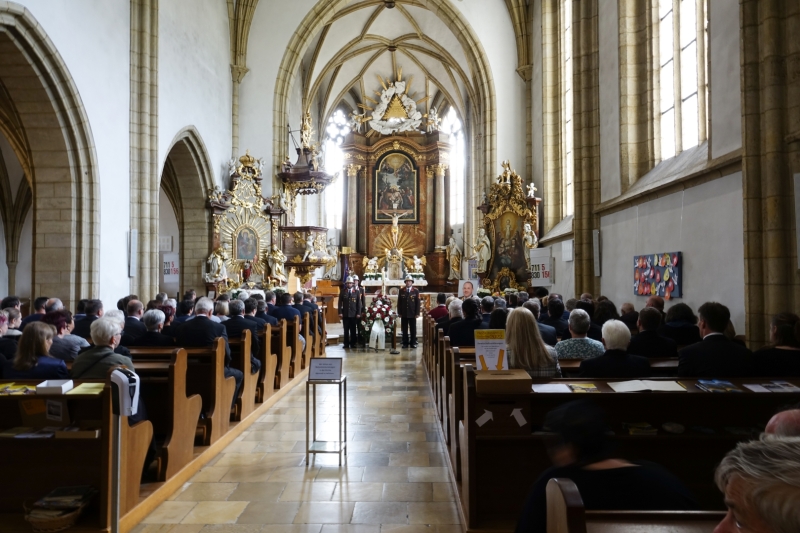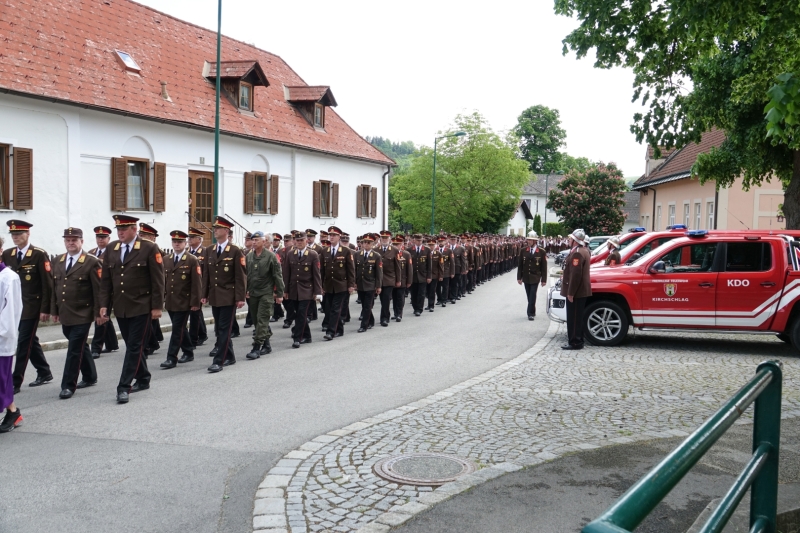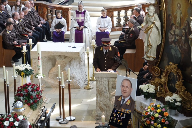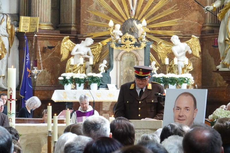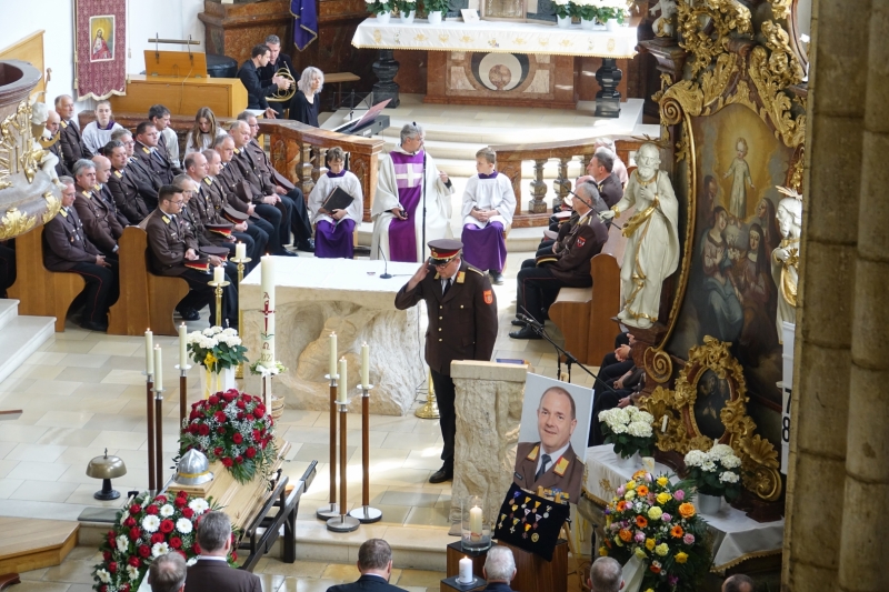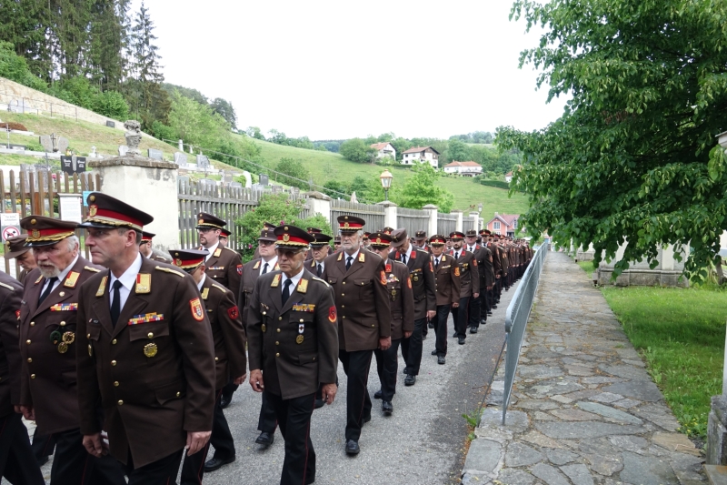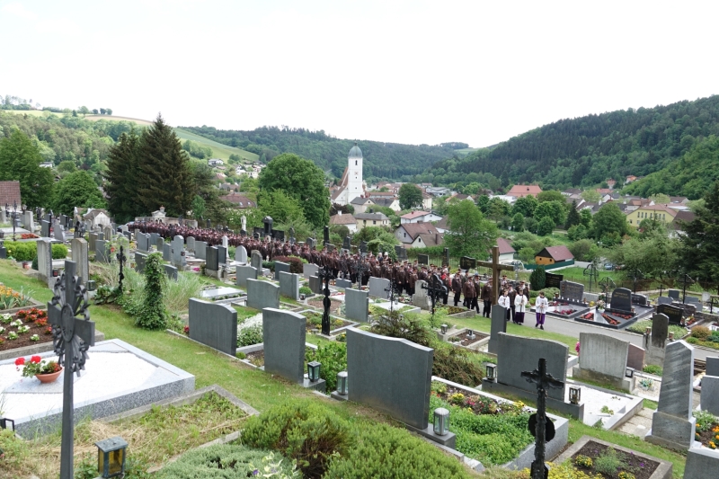 Im Anschluss wurde der Sarg von den Mitgliedern den FF Aigen in einem langen Trauerzug von der Pfarrkirche zum bis zum Familiengrab am Friedhof der Stadtgemeinde getragen. Danach folgte die Einsegnung umrahmt von der Feuerwehr, dem Männergesangsverein, der Stadtkapelle Kirchschlag, der Trauerfamilie und einer großen Anzahl von Trauernden aus der Bevölkerung aus nah und fern.