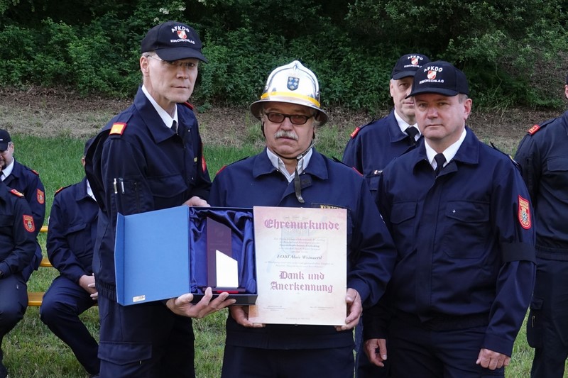 Zum Abschluss der Siegerehrung gab es noch eine Anerkennungsurkunde und Geschenke für den jahrelangen Bewerbsleiter EOBI Alois Weinzettl.