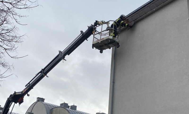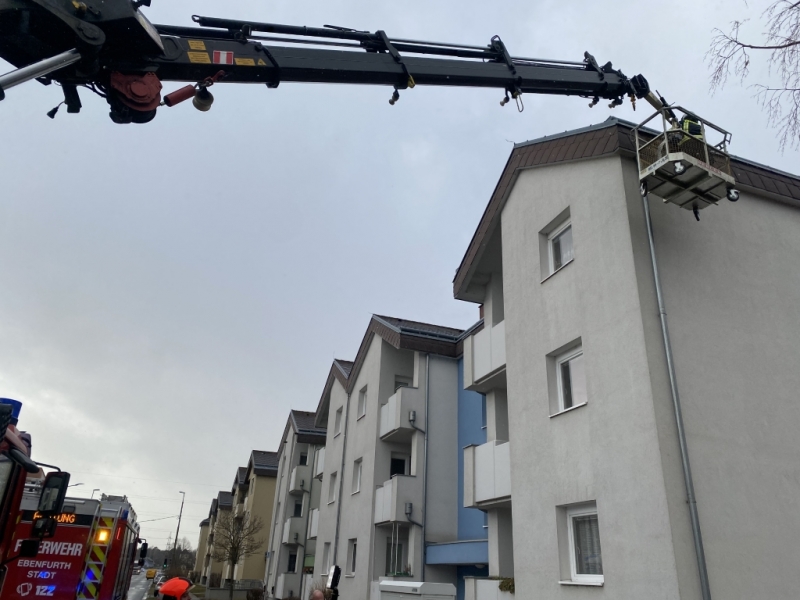 Durch die Feuerwehr mussten auf einem Dach einer Wohnanlage Sicherungsarbeiten durchgeführt werden. Dachelemente wurden vom Sturm losgerissen und stürzten auf einen Gehweg ab. Bei diesem Einsatz stand auch die FF Haschendorf unterstützend im Einsatz.