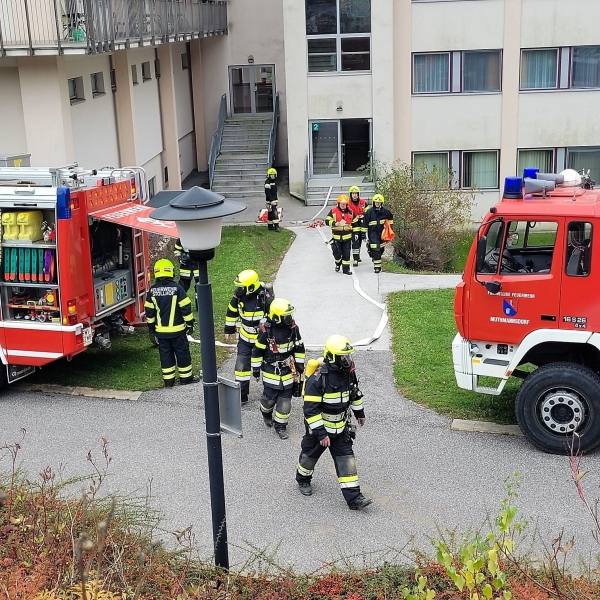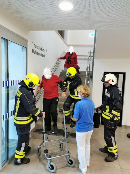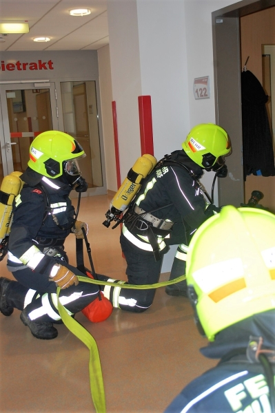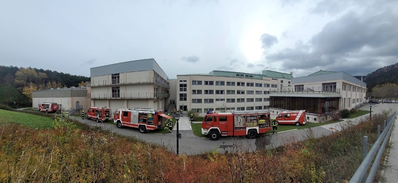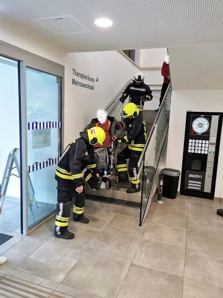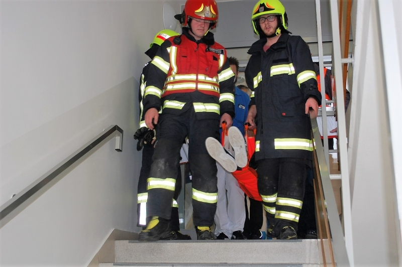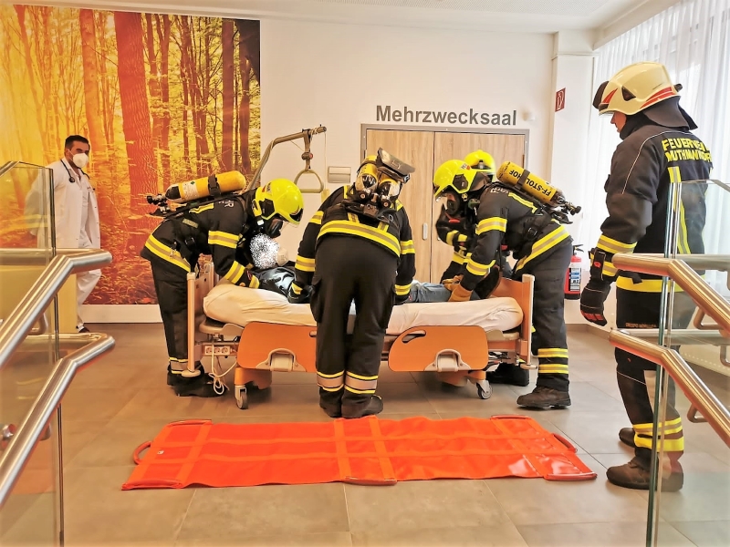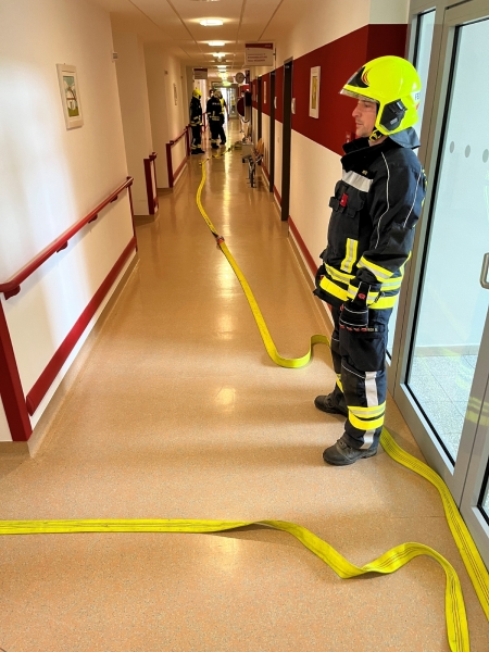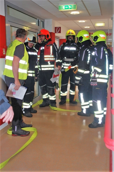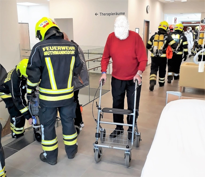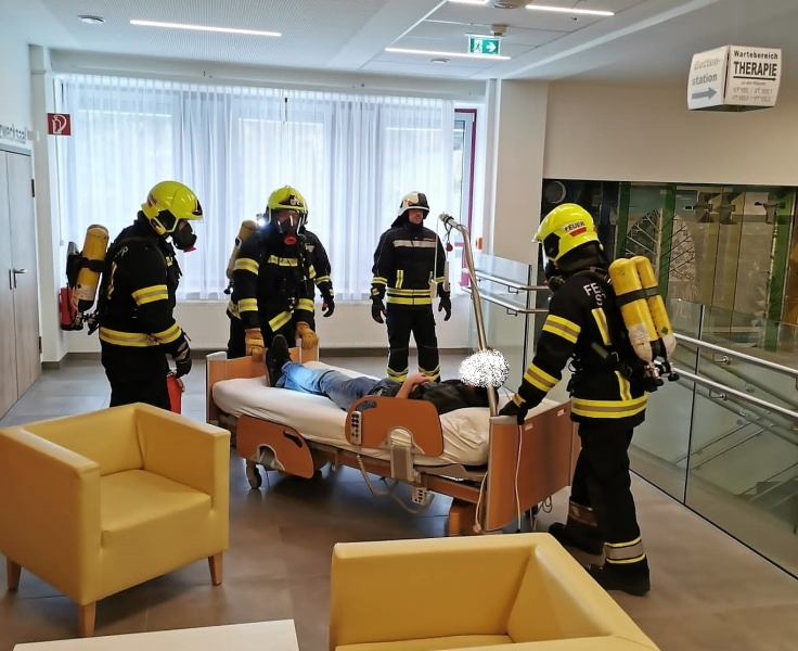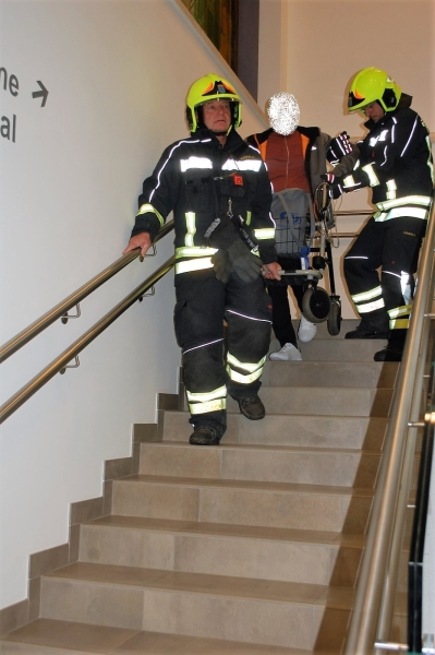 * Teilevakuierung von 33 Personen im Patiententrakt vom 1. und 2. Obergeschoss in das Erdgeschoss