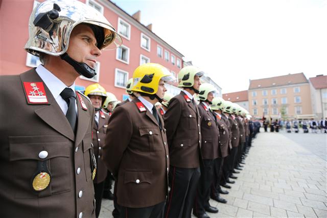 Aber die Feuerwehrleute und die Teile der Bevölkerung, die solche Querelen nicht verstanden, ließen sich nicht abhalten, das perfekte Wetter auszunutzen. Am Samstag fand am Morgen am Hauptplatz, direkt vor dem neugestalteten Marienplatz, der Hauptrapport statt. Über 300 Feuerwehrmitglieder bildeten den Marschblock – begleiteten doch die Kameradinnen und Kameraden der Feuerwehren der Neustädte in Europa die Mitglieder der Feuerwehr Wiener Neustadt. Angeführt wurde der Marschblock von der Eisenbahnermusik „Flugrad“ und den Caledonian Pipes and Drums Burgenland, die in einem genialen „Duett“ der beiden Ensembles, auch während des Hauptrapports die hunderte Zuschauer aus der Bevölkerung begeisterten.