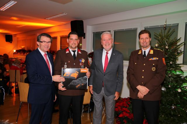 Unser Herr Bürgermeister übernimmt jedes Jahr einen Wunsch von Feuerwehrkameraden, die im Vorfeld der Weihnachtsfeier gesammelt werden. Heuer wurde aus dieser Aktion heraus eine Schnittschutzhose für den Ausbildungszug an Zugskommandant Sigmund Spitzer übergeben.
