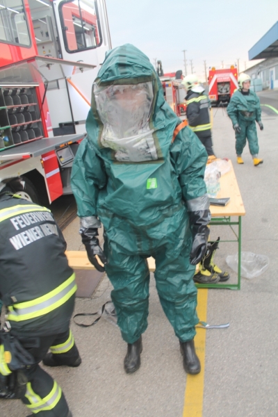 "Verunfallter Gefahrgutcontainer mit auslaufender Flüssigkeit auf einem Betriebsgelände!" Dies war die Übungsannahme bei einer Schadstoffübung der Freiwilligen Feuerwehr Wiener Neustadt am Abend des 27. April. Ziele der Übung waren neben Erkundung durch den Einsatzleiter auch die Kommunikation mit den Mitarbeitern der betroffenen Firma, der Einsatz im Chemieschutzanzug sowie der Aufbau eines Not- Dekoplatzes.Die Übung, welche am Gelände einer Chemiefirma in Wiener Neustadt stattfand, war der Abschluss des heurigen Frühjahrsübungsplans "Schadstoff", in dessen Rahmen heuer bereits bei mehreren Fortbildungen innerhalb der Feuerwehr Wiener Neustadt ähnliche Themengebiete behandelt wurden. Ziel der Übung war, die zuvor vorgetragenen Themen in einem zusammenfassenden Ereignis praktisch anzuwenden und die teilnehmenden Einsatzkräfte dabei möglichst Einsatznahe zu fordern.