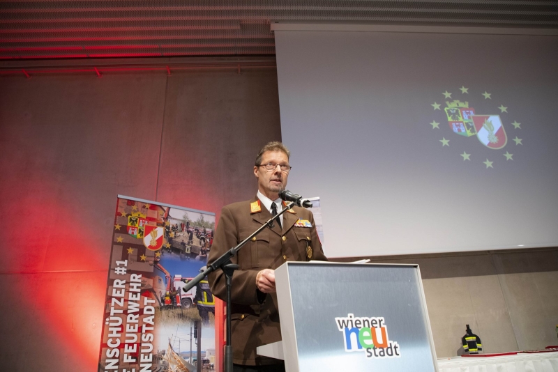 Auch Kommandant Pfeiffer sprach in seiner Rede Dank den Feuerwehrmitgliedern aus. Er dankte für den Zusammenhalt und die Leistungen bei der Vielzahl der Einsätze. Auch Pfeiffer erwähnte in seiner Rede, dass bei dem rasanten Wachstum der Stadt auf die Infrastruktur der Feuerwehr nicht vergessen werden darf, denn schließlich wachsen mit der Stadt auch die Aufgaben der Feuerwehr. Schon heute spürt man in der Feuerwehr Wiener Neustadt die Auswirkungen.
