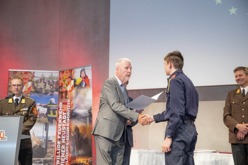 Seit 160 Jahren bildet nun die Feuerwehr der Stadt Wiener Neustadt eine der wesentlichen Säulen der Sicherheit für unsere Heimatstadt, immer bestehend aus Bürgern, und seit dem Jahre 2021 auch aus Bürgerinnen dieser Stadt, die fast ausschließlich freiwillig den Dienst für das Wohl und die Sicherheit der Einwohner leisteten und leisten. Feuerwehr bedeutet Hilfe, Rettung, Schutz, und Sicherheit für die Bevölkerung. Die Feuerwehr leistet Hilfe bei jedweder Gefahr, Bedrohung, oder Katastrophe, sie ist immer da, stets bereit rasch einzugreifen, wenn sie gebraucht wird. Und wenn wir unseren Blick in den Osten Europas lenken, wo gerade ein im höchsten Maße verwerflicher und menschenverachteter Krieg stattfindet, so sehen in Berichten immer wieder Feuerwehrangehörige, die in völlig zerstörten Städten und Orten, ohne funktionierender Infrastruktur, immer noch unter höchster Gefährdung des eigenen Lebens, bis zuletzt der eigenen Bevölkerung Schutz und Hilfe, und vielleicht auch Hoffnung und Zuversicht zukommen lassen. Auch unsere Stadt hat in ihrer Geschichte solch kriegerische Zeiten erleben müssen, und auch unsere Feuerwehr bot der Bevölkerung im noch möglichen Umfang Versorgung, Unterstützung, und Hilfe. 160 Jahre lang bietet nun die Feuerwehr Wiener Neustadt unserer oftmals geprüften und getroffenen, aber auch ebenso blühenden und wachsenden Heimatstadt konstant und unerschütterlich Schutz und Sicherheit. Dies ist nur möglich, weil sich die Feuerwehr im Allgemeinen, und die Feuerwehr Wiener Neustadt im ganz Besonderen, aus Menschen einer ganz besonderen Art zusammensetzt.