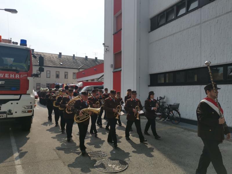Musikalisch wurde die Feier von der Eisenbahnermusik Flugrad, welche in alter Tradition in Feuerwehruniformen der Feuerwehr Wiener Neustadt auftraten, untermalt. Auch eine Fahnenabordnung des uniformierten privilegierten Bürgerkorps ehrte die Feuerwehrkameraden mit ihrer Anwesenheit im Marschblock.